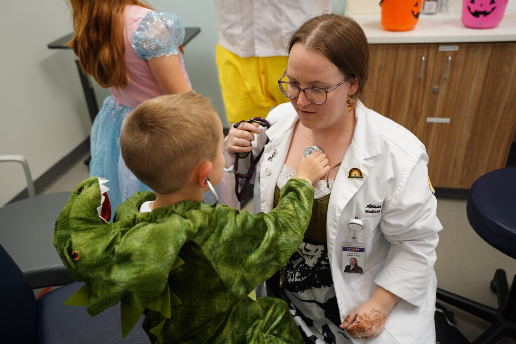 The event invited local children to don their Halloween costumes and take part in a playful, hands-on learning experience for ICOM’s student physicians. Kids rotated through mock exam stations, helping the future physicians practice pediatric skills such as listening to heart and lung sounds, checking reflexes, and performing basic physical exams – all while sharing plenty of laughs and candy along the way.