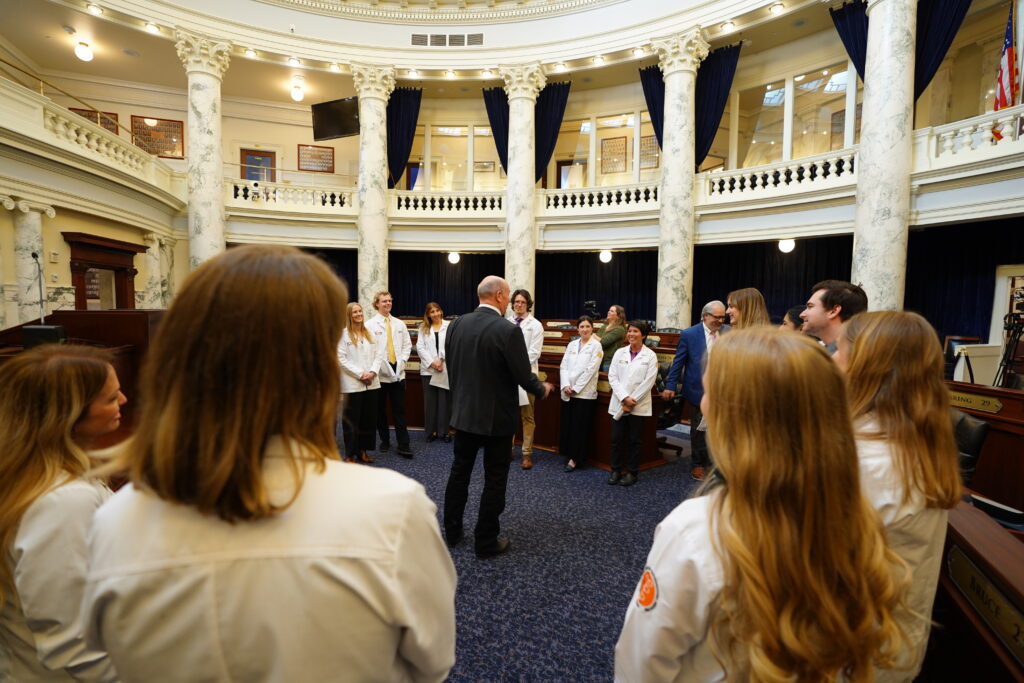 A highlight of the day included a visit with Idaho Governor Brad Little in the Ceremonial Office, where students had the chance to share their experiences, career goals, and passion for serving Idaho communities. The group also met with House Speaker Mike Moyle on the House floor for a discussion about the state’s growing medical needs and the role osteopathic physicians play in meeting them.